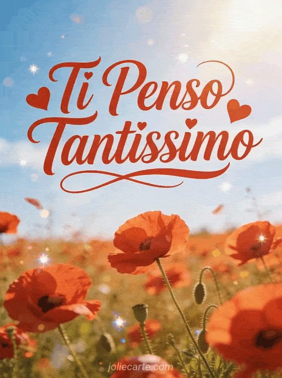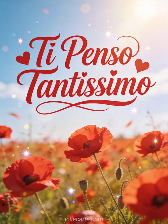 Invia una vibrante cartolina ti penso tantissimo con uno splendido campo di papaveri rossi sotto il sole estivo. Scopri anche una cartolina dolce penso a te o una cartolina divertente penso a te.