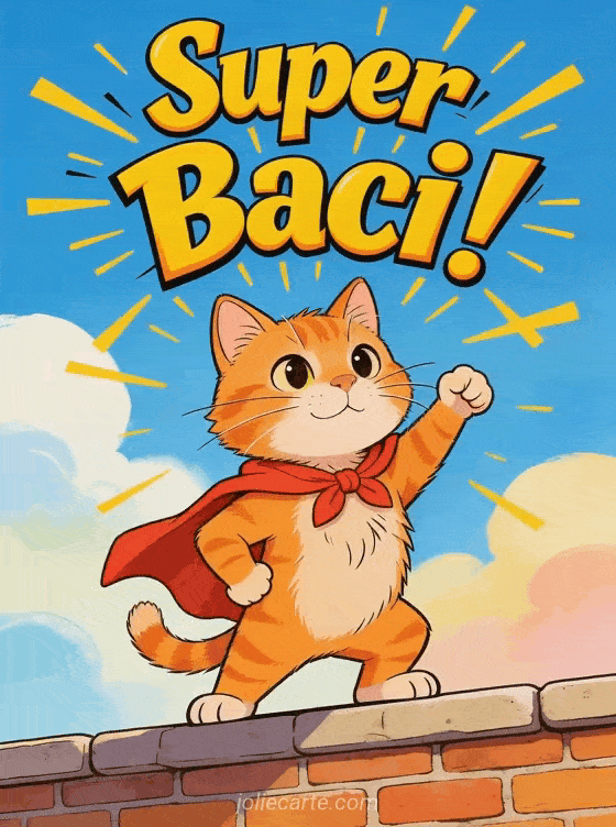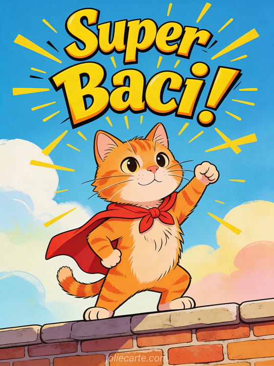Invia un saluto di super baci per rallegrare la giornata di qualcuno di speciale. Un gatto rosso con mantello rosso in posa eroica su un muretto sotto un cielo azzurro brillante con nuvole. Scopri anche un biglietto ho bisogno di baci o un biglietto di abbracci e baci.