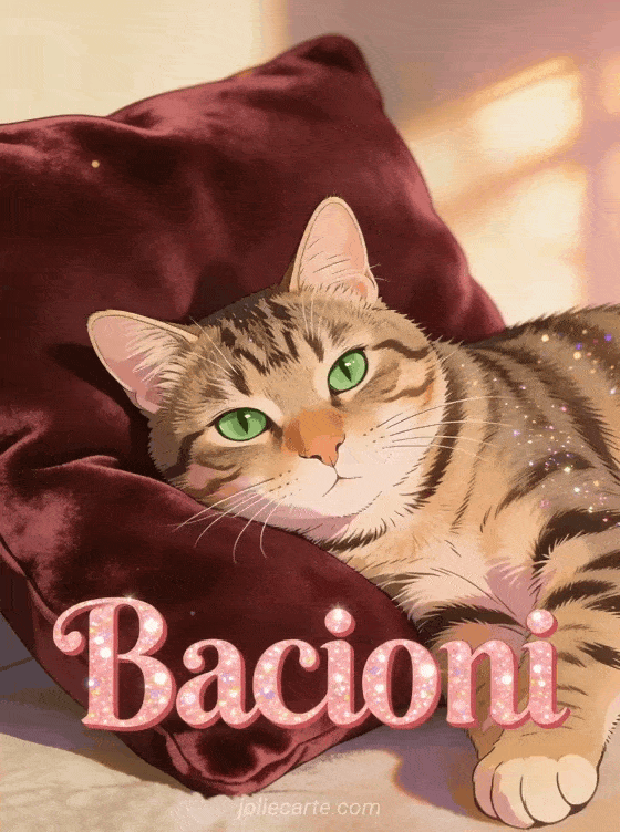 Invia un tenero biglietto di bacioni a qualcuno di caro. Un gatto tigrato dagli occhi verdi riposa su un cuscino di velluto bordeaux, immerso nella calda luce del pomeriggio. Scopri anche un biglietto di super baci o un biglietto di baci carini.