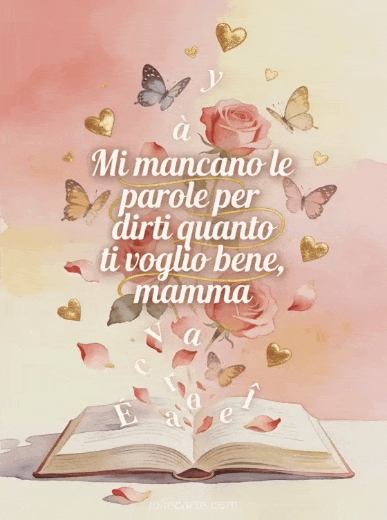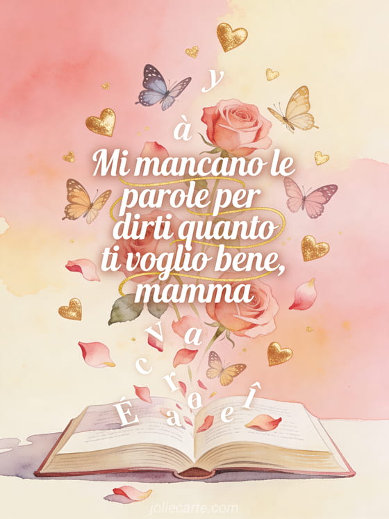 Esprimi tutto il tuo amore con questo bellissimo biglietto per la Festa della Mamma. Le parole si trasformano in farfalle e petali di rosa in un'illustrazione poetica e commovente che fara sentire speciale la tua mamma.