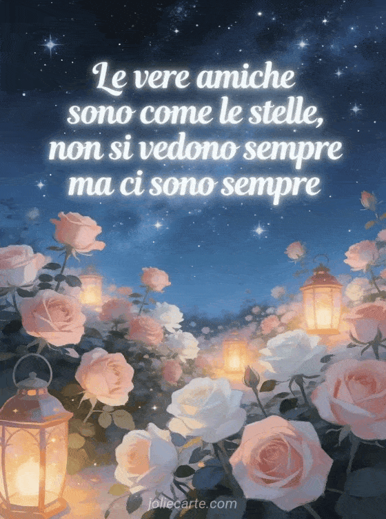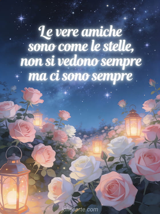Festeggia il compleanno di un'amica con questo incantevole biglietto con lettere bianche luminose sotto un cielo stellato sopra un giardino di rose illuminato da lanterne in un'atmosfera magica. Scopri anche un biglietto di compleanno amicizia o un biglietto di compleanno vintage.
