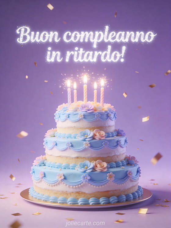 Invia un gioioso augurio di buon compleanno in ritardo con questo biglietto festivo con torta, candele e coriandoli. Scopri anche un biglietto di compleanno in ritardo con scusa o un biglietto di compleanno in ritardo con gatto.