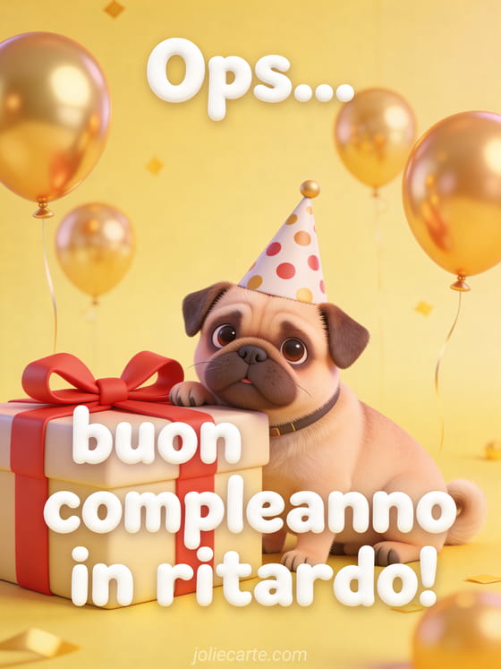 Ops! Invia questo carino biglietto di compleanno in ritardo con un adorabile carlino, palloncini e regali. Scopri anche un biglietto festivo di compleanno in ritardo o un biglietto di compleanno in ritardo con scusa.