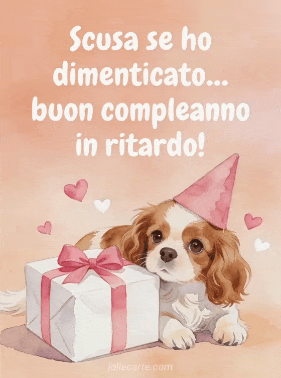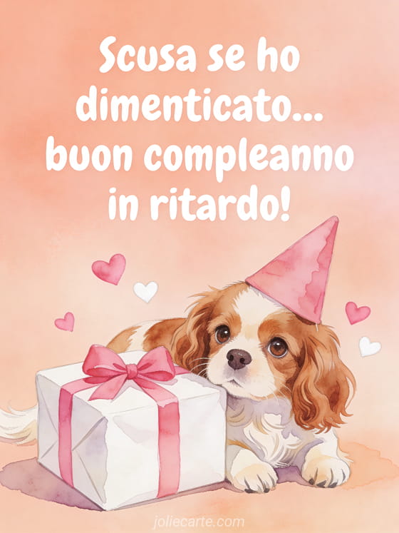 Chiedi scusa per la dimenticanza con questo tenero biglietto di compleanno in ritardo con un Cavalier King Charles, cuori e un regalo. Scopri anche un biglietto di compleanno in ritardo con gatto o un biglietto di compleanno in ritardo con fiori.