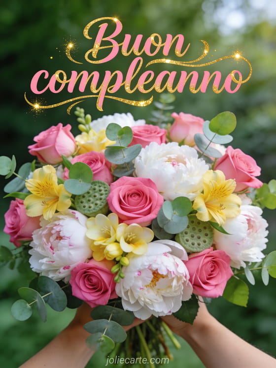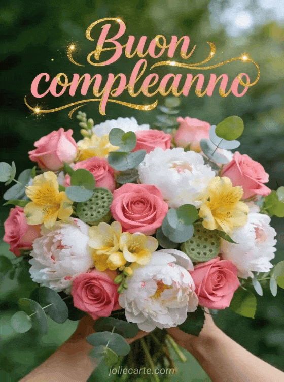 Invia un gioioso augurio di buon compleanno con un magnifico bouquet di rose e peonie per rallegrare la sua giornata. Scopri anche una ecard compleanno donna, un gif compleanno donna gratuito o un gif buon compleanno donna umorismo.