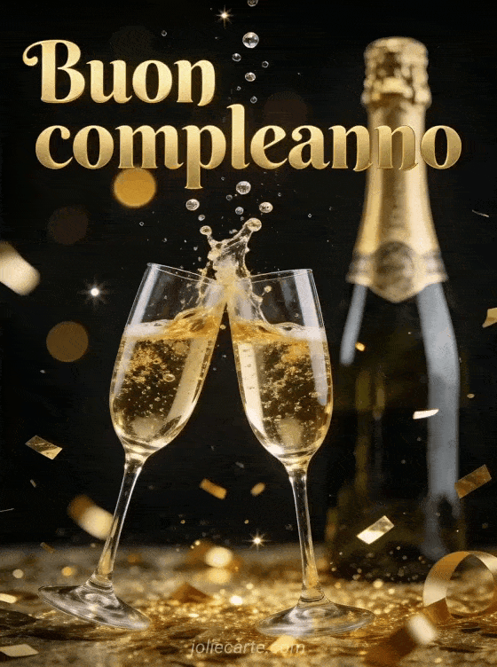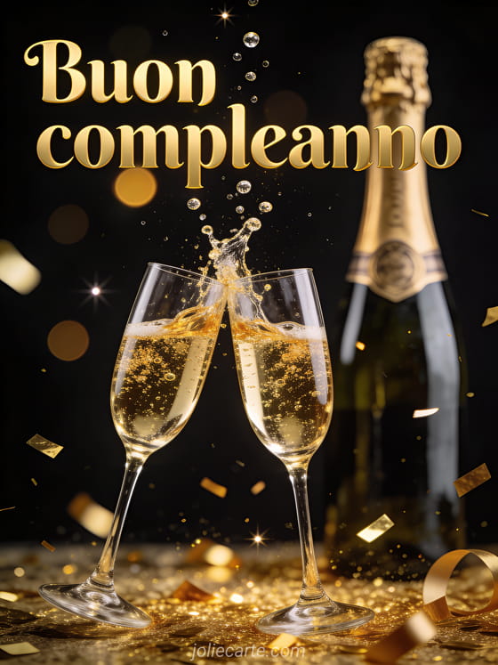 Invia questo elegante biglietto di buon compleanno per uomo con lettere dorate e bollicine di champagne, due calici di cristallo che brindano con schizzi dorati, una bottiglia vintage sullo sfondo e coriandoli dorati che cadono su uno sfondo nero profondo. Scopri anche un biglietto animato di compleanno per uomo o un biglietto di compleanno per uomo.