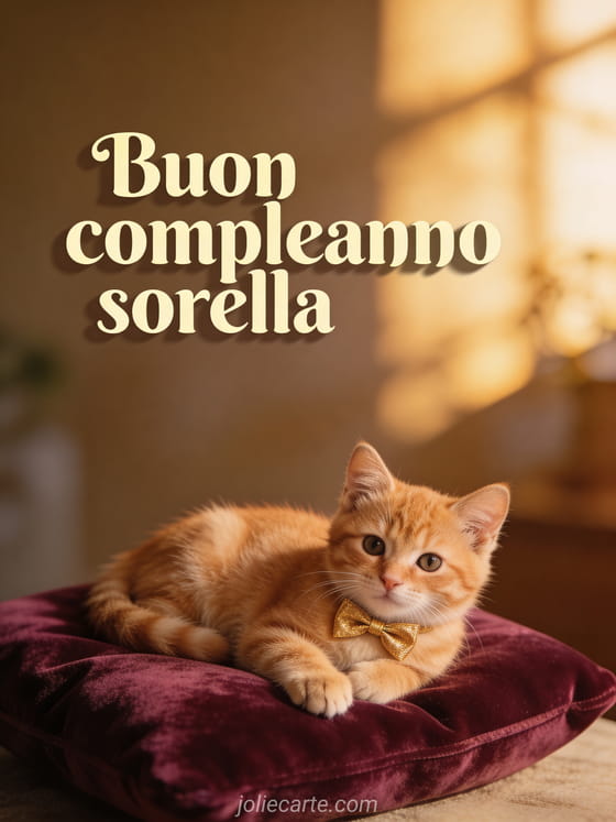 Festeggia il compleanno della tua sorella con questa adorabile cartolina gratuita. Un grazioso gattino rosso su un cuscino di velluto con papillon dorato, che ti guarda teneramente nella calda luce del pomeriggio. Scopri anche una cartolina compleanno sorella messaggio o una cartolina compleanno sorella o una cartolina compleanno sorella humor.