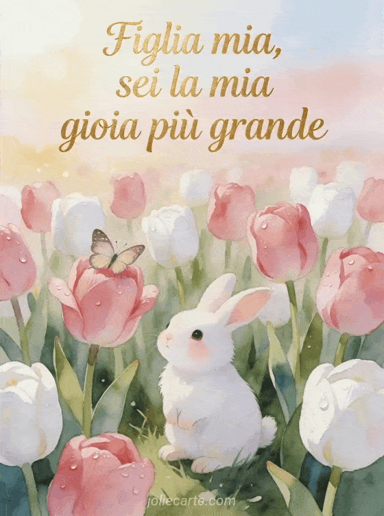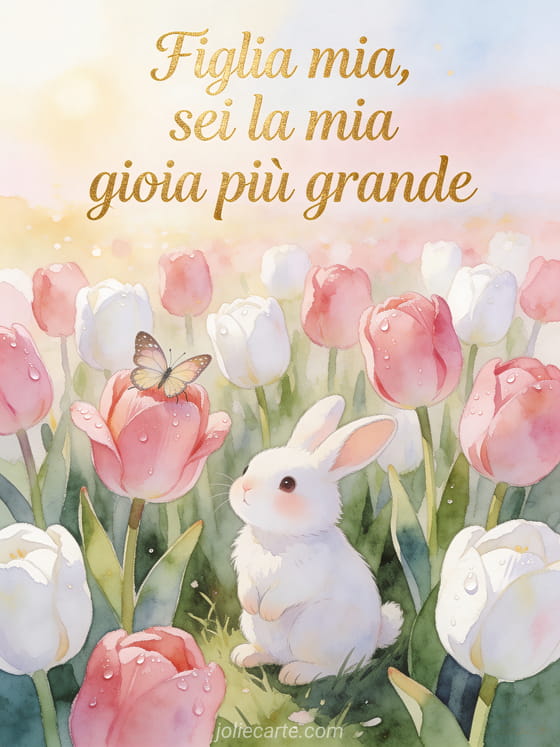 Festeggia il compleanno di tua figlia con questo adorabile biglietto ad acquerello con un coniglio bianco tra tulipani rosa e una farfalla. Scopri anche un biglietto di compleanno per figlia da mamma o un biglietto di compleanno figlia ti voglio bene.