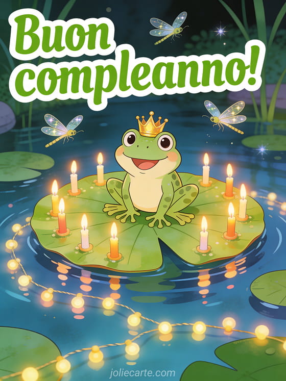 Sorprendi qualcuno con questo divertente biglietto di compleanno con una rana buffa con corona dorata seduta su una ninfea gigante decorata con libellule scintillanti. Scopri anche un biglietto di compleanno per figlia con amore o un biglietto di compleanno per figlia adorata.