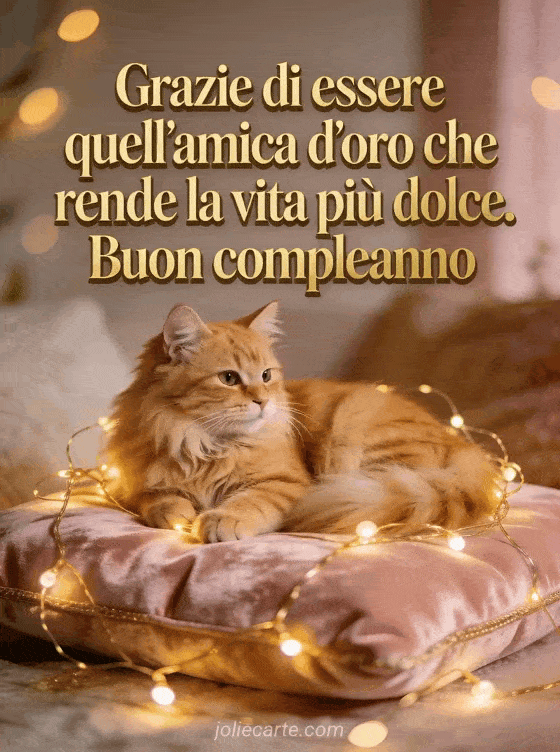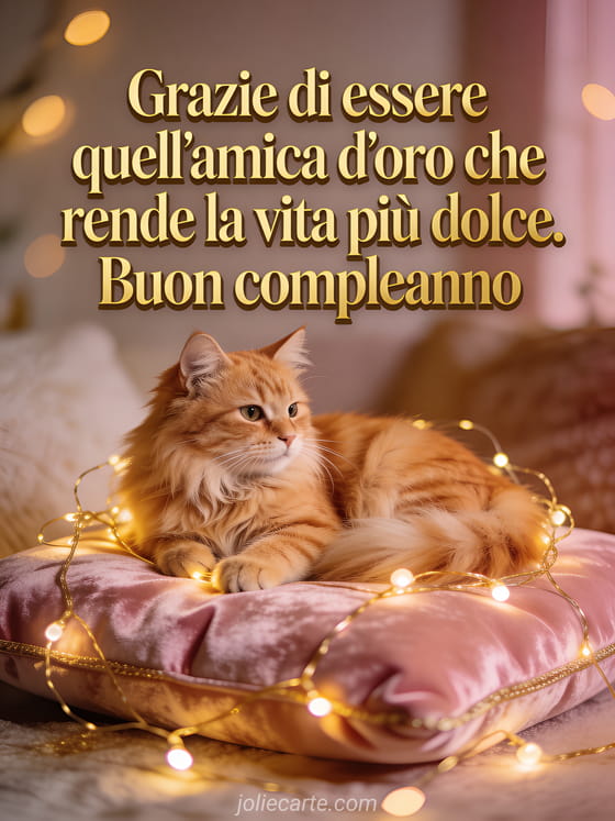Festeggia il compleanno di un'amica con questo tenero biglietto con un gatto rosso sdraiato su un cuscino di velluto rosa circondato da una ghirlanda di luci dorate, in un'atmosfera accogliente e intima. Scopri anche un biglietto di compleanno per amica o un biglietto di amicizia con tramonto.