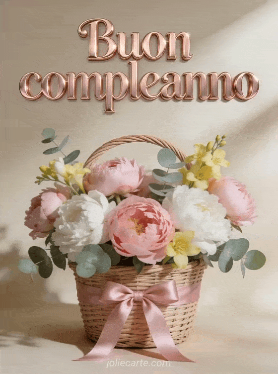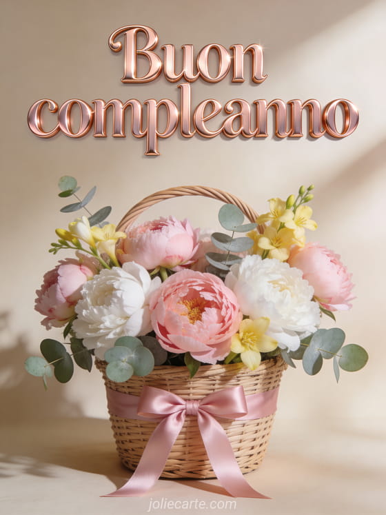 Festeggia il compleanno di un'amica con questo elegante biglietto con lettere metalliche rose gold, peonie rosa e bianche con eucalipto e fresia gialla in un cestino di vimini con nastro di raso rosa, in un'atmosfera femminile e chic. Scopri anche un biglietto di amicizia con gatto rosso o un biglietto di compleanno per amica.