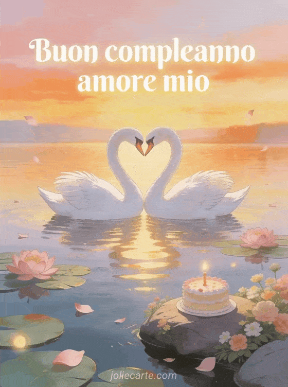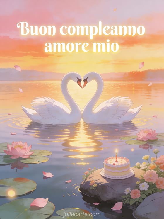 Festeggia il compleanno della persona che ami con questa bellissima cartolina gratuita. Due cigni bianchi che formano un cuore su un lago calmo al tramonto con riflessi dorati, ninfee rosa e una torta di compleanno. Scopri anche una cartolina di buon compleanno amore mio o una cartolina di compleanno per il mio amore o una cartolina di compleanno romantica.