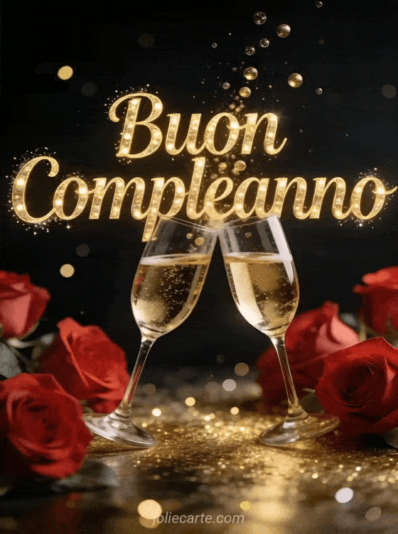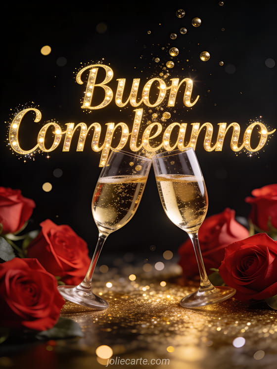 Festeggia un compleanno speciale con questo elegante biglietto con coppe di champagne e rose rosse con scintillii dorati. Scopri anche un biglietto di compleanno divertente o un biglietto con frase di compleanno.