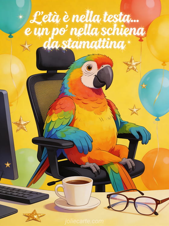 Invia questa esilarante cartolina di compleanno con un pappagallo colorato su una sedia da ufficio con tazza di caffè e occhiali da lettura. Scopri anche una cartolina divertente compleanno lontra o una cartolina glamour compleanno gatto.