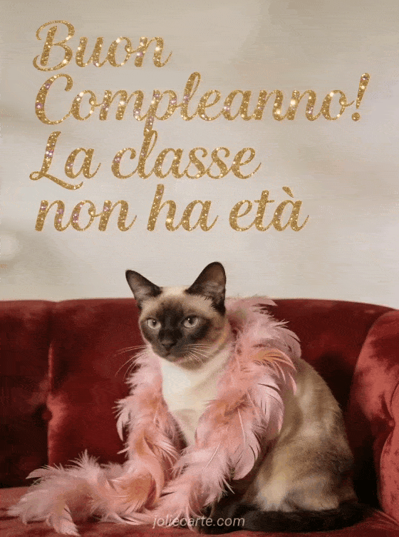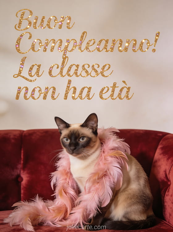 Invia questa glamour cartolina di compleanno con un favoloso gatto siamese con boa di piume rosa su un divano di velluto rosso. Scopri anche un gif divertente compleanno gatto o una cartolina compleanno divertente donna.