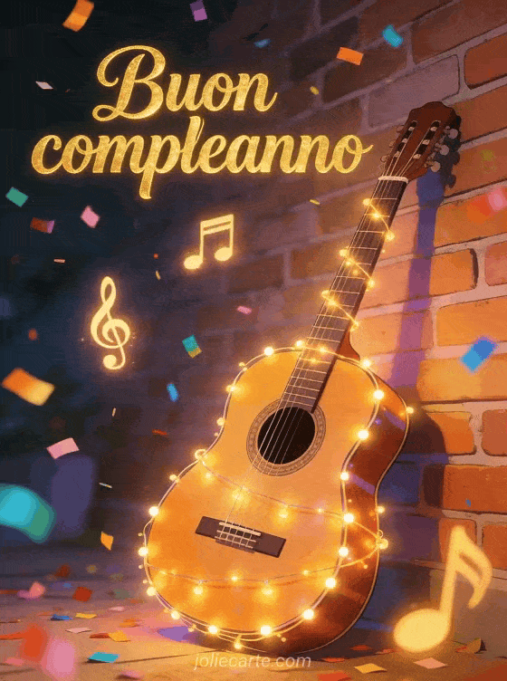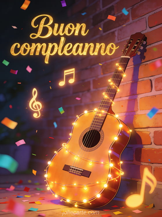 Invia questo allegro biglietto di buon compleanno con lettere dorate e coriandoli colorati, una chitarra acustica adornata con lucine decorative contro un muro di mattoni, e note musicali luminose che fluttuano nell'aria. Scopri anche un biglietto musicale di compleanno con pianoforte o un biglietto animato di compleanno con carillon.