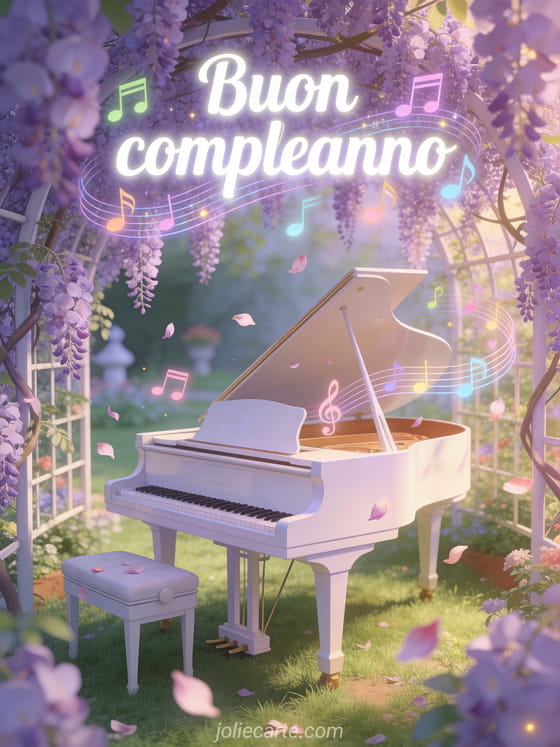 Invia questo incantevole biglietto di buon compleanno con un pianoforte bianco in un giardino fiorito di glicine viola, note musicali colorate che danzano e petali che volano nella brezza. Scopri anche un biglietto animato di compleanno con carillon o un biglietto animato di compleanno con fiori.