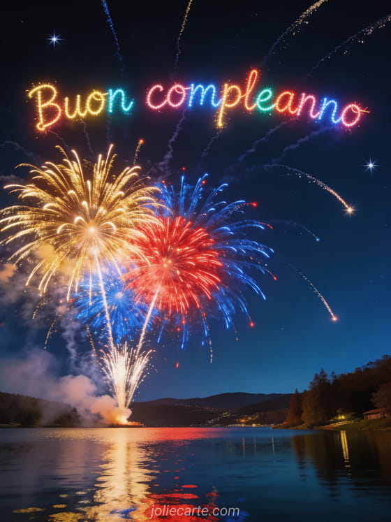 Invia questo magnifico biglietto di buon compleanno con spettacolari fuochi d'artificio che esplodono in cascate dorate, rosse e blu sopra un lago, con stelle cadenti e riflessi che brillano sull'acqua. Scopri anche un biglietto animato di compleanno con fiori o un biglietto di compleanno per bambini.