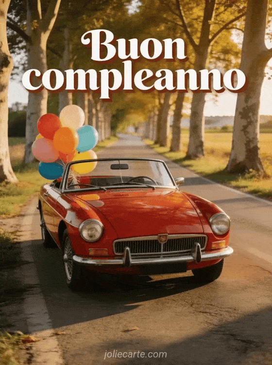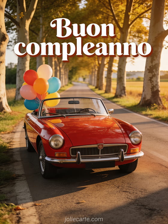 Invia questo affascinante biglietto di buon compleanno con una magnifica auto d'epoca rossa decappottabile parcheggiata su una strada di campagna fiancheggiata da platani, con palloncini colorati legati allo specchietto retrovisore, immersa nella luce dorata. Scopri anche un biglietto di auguri.