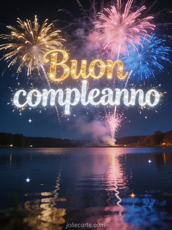 Festeggia un compleanno con questo straordinario biglietto con lettere dorate scintillanti, magnifici fuochi d'artificio multicolori che esplodono sopra un lago tranquillo sotto un cielo stellato. Scopri anche un biglietto di compleanno con lettere dorate o un biglietto di compleanno con lontra.