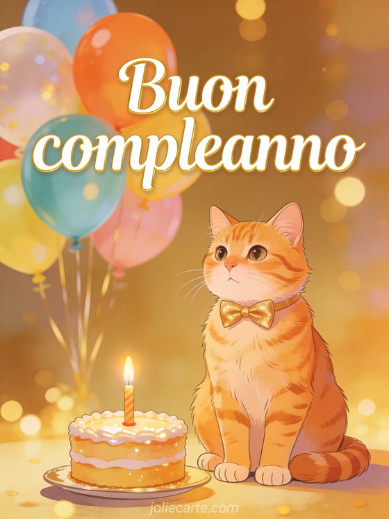 Festeggia un compleanno con questo incantevole biglietto con un adorabile gatto rosso tigrato con papillon dorato accanto a una torta con una candela accesa, palloncini colorati e caldo bokeh dorato. Scopri anche un biglietto di compleanno con fuochi d'artificio o un biglietto di compleanno con lettere dorate.