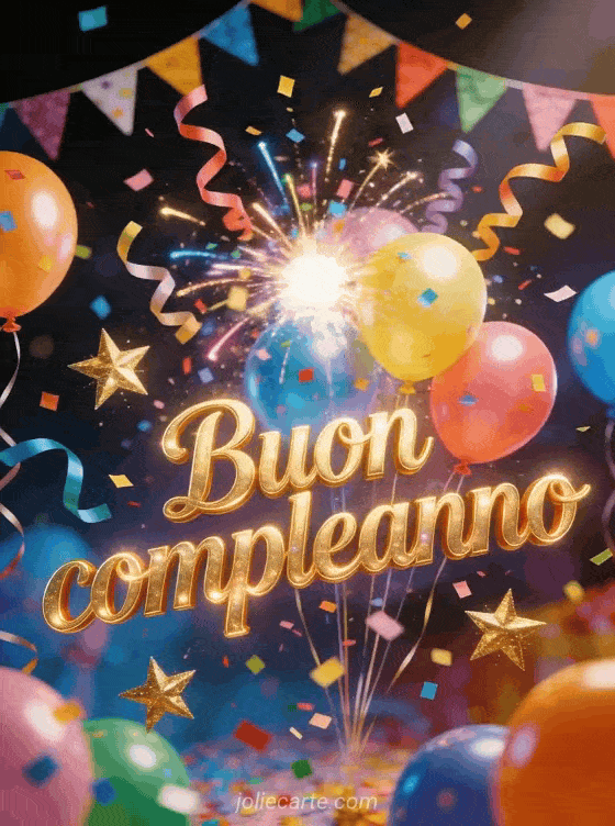 Festeggia un compleanno con questo vivace biglietto con lettere dorate festive, un'esplosione di coriandoli multicolori e stelle filanti, palloncini colorati e stelle dorate scintillanti. Scopri anche un biglietto di compleanno con golden retriever o un biglietto di compleanno con gatto.