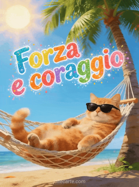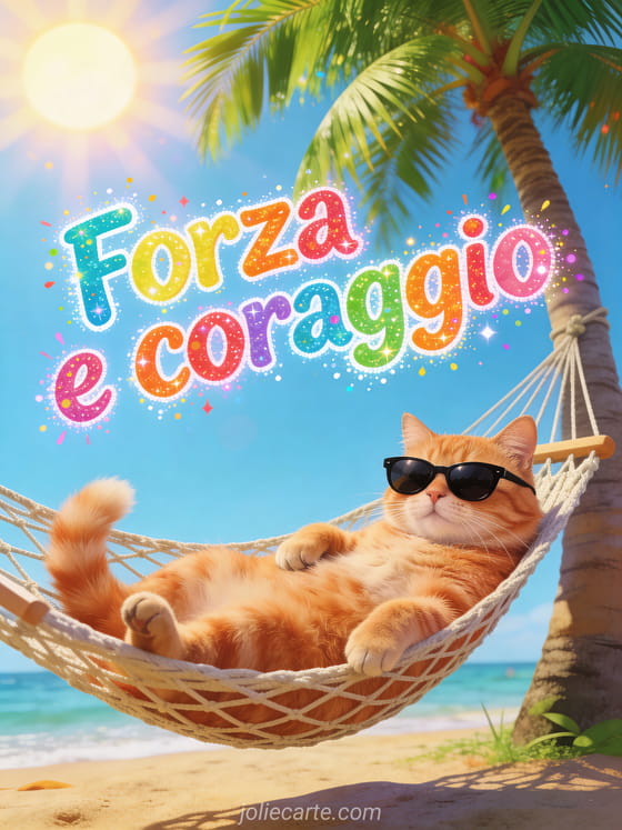 Invia questo divertente biglietto di incoraggiamento con un gatto rosso con occhiali da sole sdraiato su un'amaca sotto una palma per rallegrare qualcuno. Scopri anche un biglietto di coraggio per momenti difficili o un biglietto di coraggio gratuito o un biglietto di coraggio ispiratore.