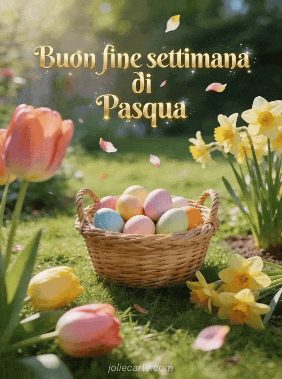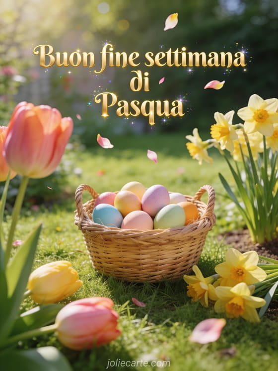 Festeggia il fine settimana di Pasqua con questo grazioso biglietto che raffigura un cestino di vimini pieno di uova colorate in un giardino fiorito. Scopri anche un biglietto buon fine settimana di Pasqua a tutti.