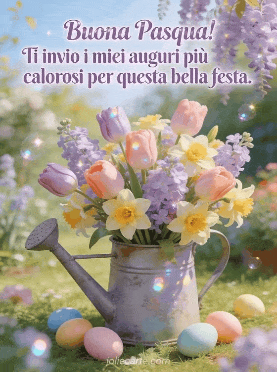 Invia i tuoi auguri più calorosi di Pasqua ai tuoi cari con questo bellissimo biglietto primaverile. Scopri anche un messaggio di Pasqua per un amico, un augurio di Pasqua o un' immagine di Pasqua da scaricare.