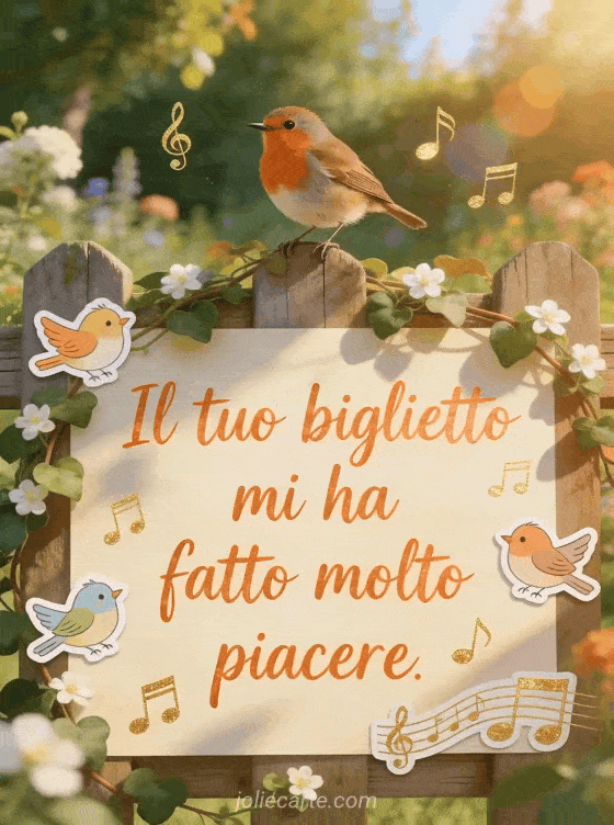 Il tuo biglietto mi ha fatto molto piacere un gioioso biglietto di ringraziamento con un pettirosso in un giardino