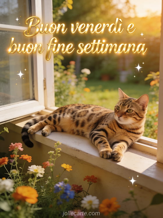 Invia un allegro saluto di buon venerdì con un gatto bengal che riposa in un giardino soleggiato per augurare un meraviglioso fine settimana. Scopri anche una cartolina venerdì piovoso o una gif divertente del venerdì.