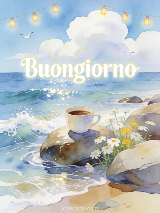 Inizia la giornata con una brezza fresca inviando questo bel biglietto del buongiorno con caffè. Una tazza di caffè riposa su una roccia liscia in riva al mare con onde dolci, margherite bianche e gialle tra le rocce, gabbiani in lontananza e lanterne scintillanti. Scopri anche un biglietto buongiorno baci con caffè o un biglietto mi manchi.