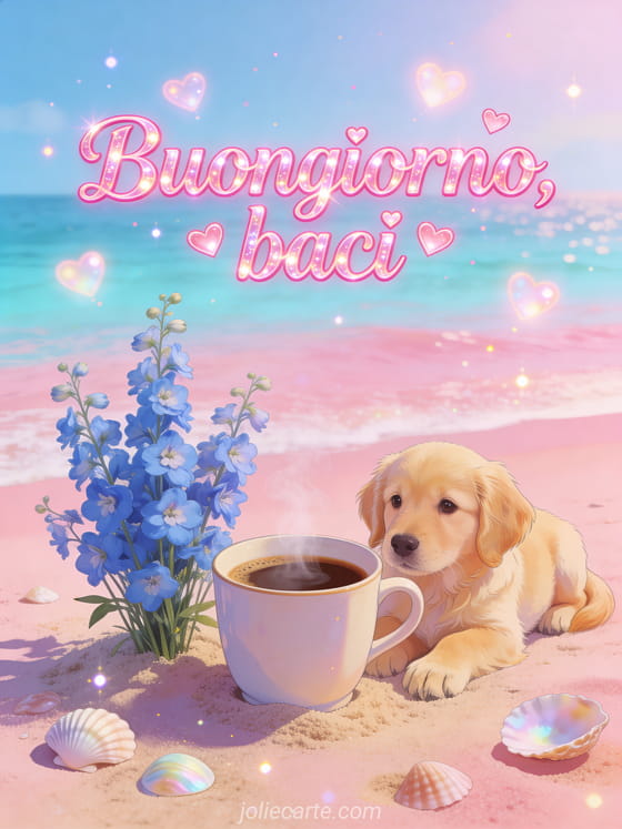 Invia un caloroso buongiorno con questo tenero biglietto del caffè. Una tazza di caffè fumante riposa sulla sabbia rosa di una spiaggia pastello accanto a delfini blu e un cucciolo di golden retriever dallo sguardo tenero, mentre cuori luminosi fluttuano nell'aria. Scopri anche un biglietto mi manchi.