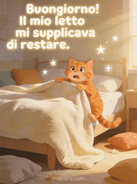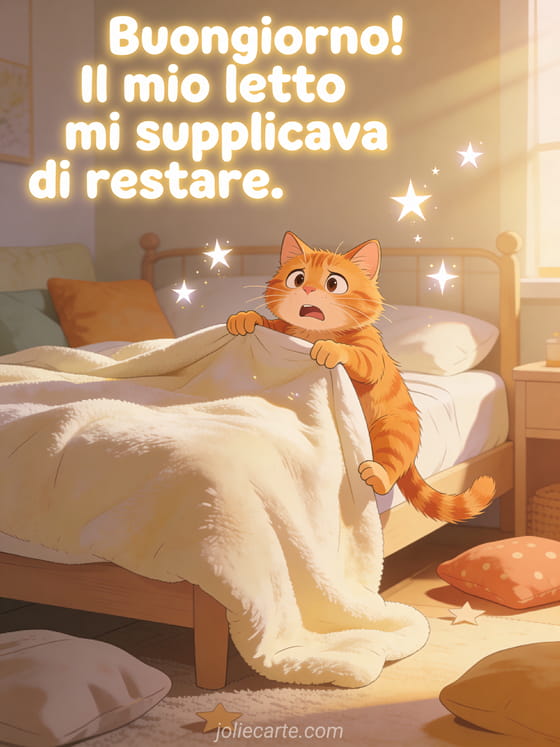 Buongiorno! Il mio letto mi supplicava di restare un saluto mattutino divertente per gli amanti del letto