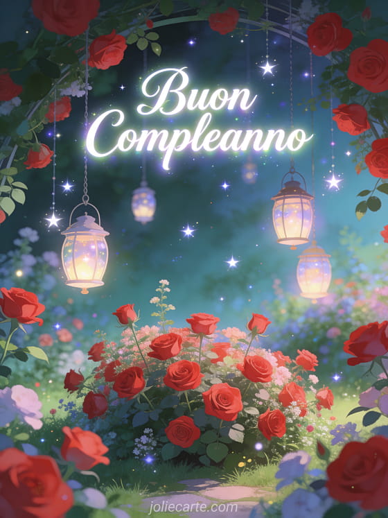 Augura buon compleanno con questo fiabesco biglietto con un giardino fiorito di rose rosse e lanterne sospese sotto stelle scintillanti. Scopri anche un biglietto di compleanno con lavanda o un biglietto di compleanno con cuore di rose.