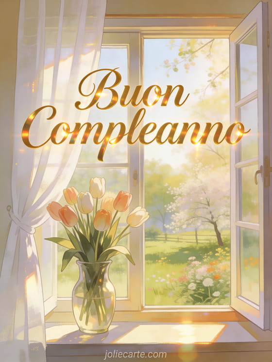 Augura buon compleanno con questo rilassante biglietto con un vaso di tulipani sul davanzale di una finestra con tende bianche di voile e un paesaggio primaverile nella luce dorata. Scopri anche un biglietto elegante di compleanno con champagne o un biglietto di compleanno con farfalla.