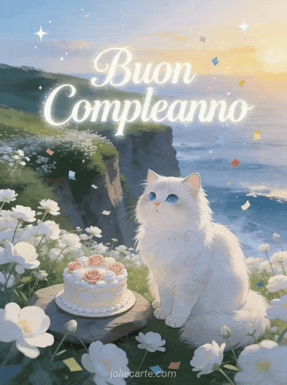 Augura buon compleanno con questo biglietto poetico con un gatto persiano bianco accanto a una torta decorata con rose su una scogliera affacciata sul mare al tramonto. Scopri anche un biglietto di compleanno con cavallo o un biglietto di compleanno costiero per lei.