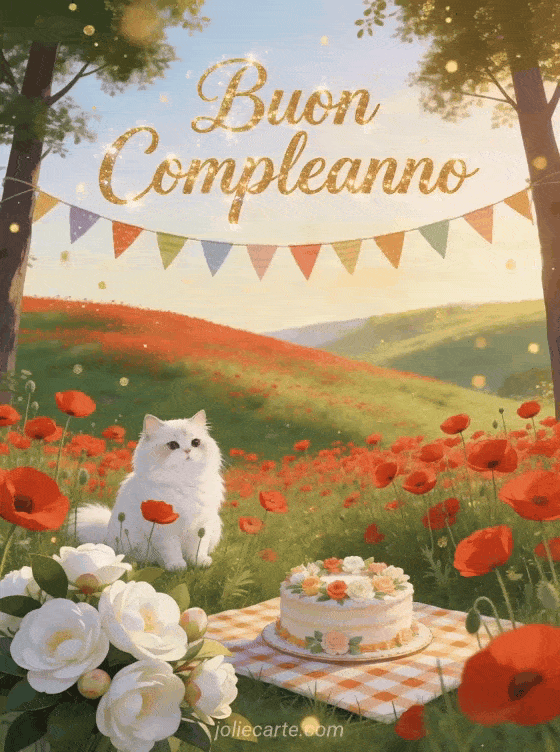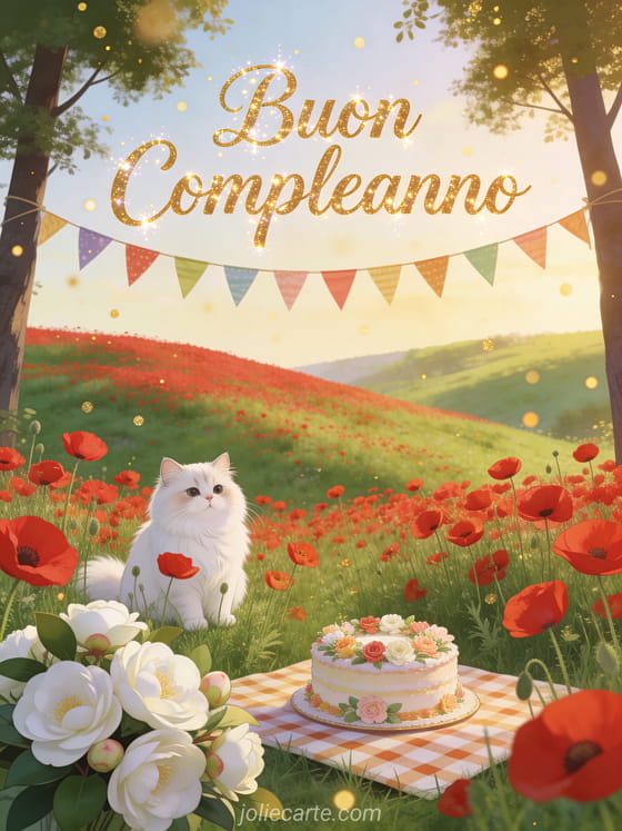 Festeggia un compleanno con questo incantevole biglietto campestre che mostra un gatto persiano bianco seduto tra papaveri rossi su una collina verde, camelie bianche, festoni colorati, una torta decorata con fiori su una tovaglia a quadri e particelle dorate nella calda luce dorata. Scopri anche un biglietto di compleanno animato o un biglietto di compleanno con auto d'epoca.