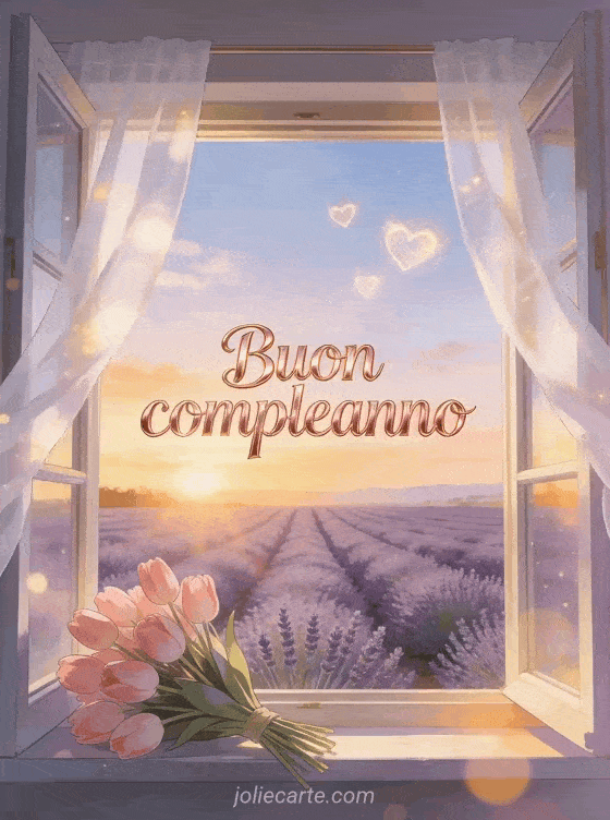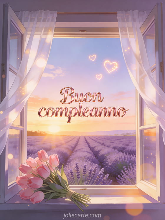 Festeggia un compleanno romantico con questo bellissimo biglietto che mostra una finestra aperta con vista su campi di lavanda al tramonto, un mazzo di tulipani rosa sul davanzale, tende bianche che svolazzano al vento e cuori luminosi nel cielo. Scopri anche un biglietto di compleanno d'amore o un biglietto di buon compleanno tesoro.