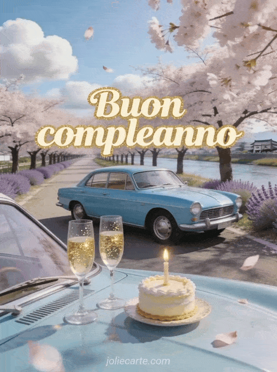 Festeggia un compleanno con questo affascinante biglietto retrò che mostra un'auto d'epoca azzurro pastello parcheggiata sotto i ciliegi in fiore lungo un fiume in Giappone, con coppe di champagne e una torta di compleanno. Scopri anche un biglietto di compleanno con faro o un biglietto di compleanno con farfalla.