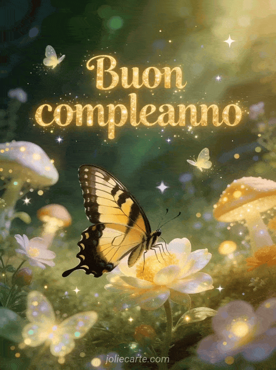 Buon compleanno una magica farfalla in una radura incantata
