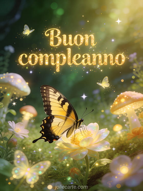 Festeggia un compleanno con questo incantevole biglietto che mostra una magnifica farfalla macaone posata su un fiore fatato in una radura magica con funghi luminosi, lucciole e stelle scintillanti. Scopri anche un biglietto di compleanno sulla sabbia o un biglietto di compleanno a sorpresa.