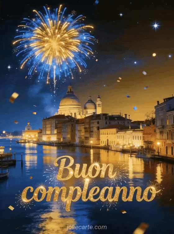 Festeggia un compleanno in grande stile con questo spettacolare biglietto con fuochi d'artificio dorati e blu nel cielo notturno sopra una città illuminata con riflessi su un fiume. Scopri anche un biglietto di compleanno per lui o un biglietto di compleanno con fiori.