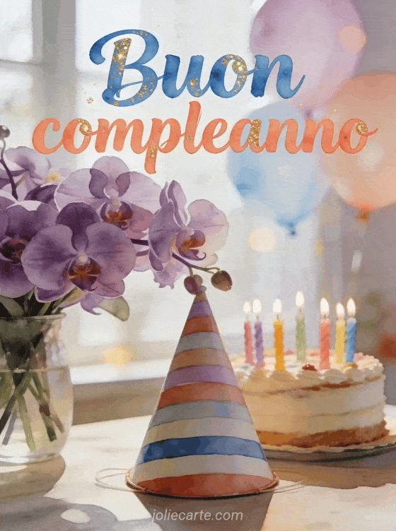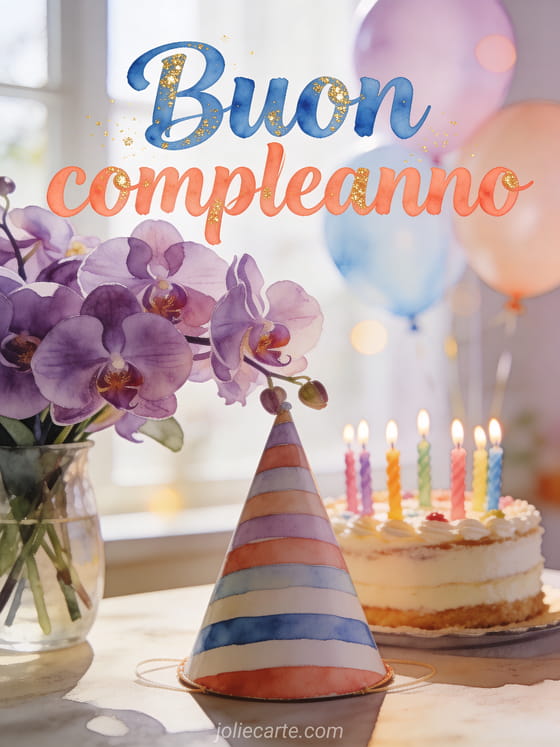 Festeggia un compleanno con questo splendido biglietto fotorealistico con un magnifico bouquet di orchidee viola con un cappellino da festa a righe, una torta decorata con candeline colorate e palloncini pastello in una luce naturale morbida. Scopri anche un biglietto di compleanno per bambina o un biglietto di compleanno per bambini.