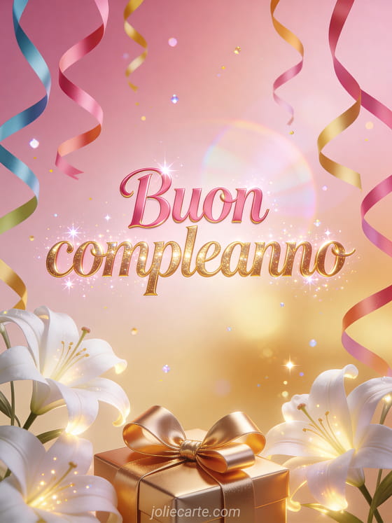Festeggia un compleanno speciale con questo incantevole biglietto con gigli bianchi luminosi circondati da stelle filanti colorate e un fiocco regalo dorato su uno sfondo rosa e dorato scintillante. Scopri anche un biglietto di compleanno fatato o un biglietto di compleanno carino.