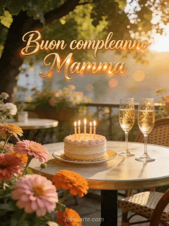 Invia questo tenero biglietto di compleanno per la Mamma con un'elegante torta di compleanno e champagne frizzante su una terrazza di caffè fiorita all'ombra di un tiglio all'alba dorata. Scopri anche un messaggio di compleanno per la Mamma o un testo toccante di buon compleanno Mamma.