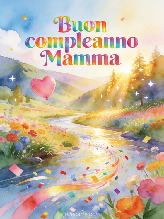 Festeggia il compleanno della tua mamma con questo bellissimo biglietto gratuito con una valle fiorita con fiume, un palloncino rosa a cuore, coriandoli colorati e luce dorata. Un augurio vibrante in acquerello. Scopri anche un immagine di compleanno per mamma o un biglietto animato di compleanno per mamma.