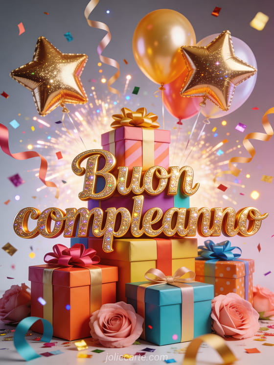 Invia un festoso biglietto di compleanno con regali impilati con fiocchi colorati, palloncini dorati e rosa a forma di stella, esplosione di coriandoli e brillantini. Atmosfera calda e luminosa. Scopri anche un biglietto di compleanno per mamma o un biglietto virtuale di compleanno per mamma.