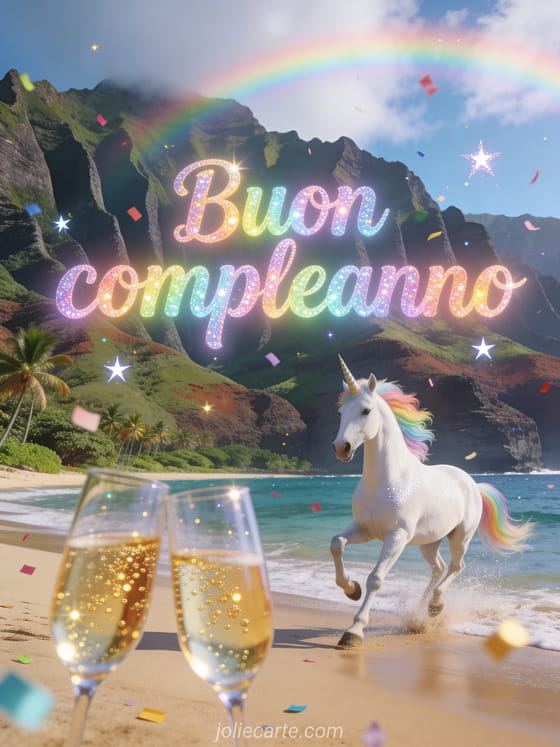 Sorprendi tua figlia con questo incantevole biglietto di compleanno gratuito con un maestoso unicorno dalla criniera arcobaleno che galoppa sulla spiaggia, champagne e coriandoli. Una festa fiabesca sotto l'arcobaleno. Scopri anche un biglietto di compleanno per mia figlia o un biglietto di auguri per la mia ragazza.