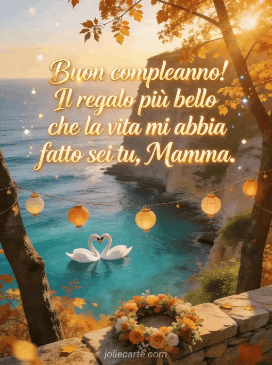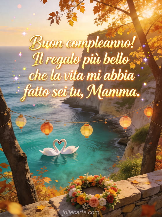 Festeggia il compleanno della tua mamma con questo bellissimo biglietto gratuito con una poetica scena costiera autunnale, cigni e luce dorata. Un modo affettuoso per dirle che è il regalo più bello della vita. Scopri anche un biglietto di compleanno commovente per mamma o un biglietto di auguri per mamma.